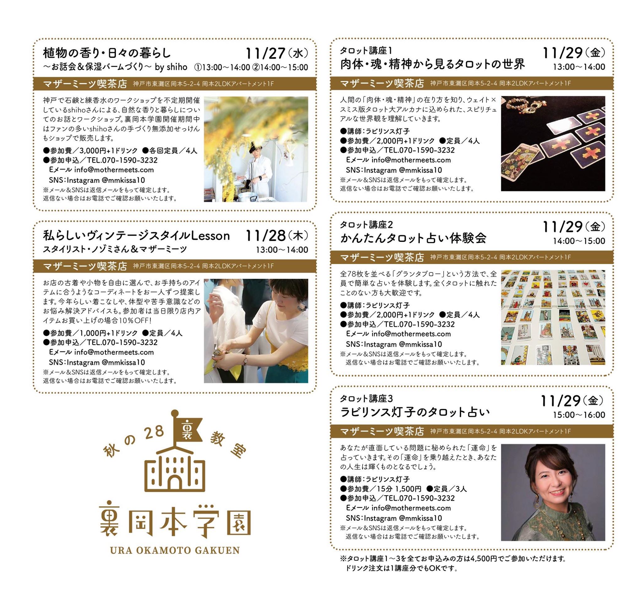 | 内容 | 人間の「肉体・魂・精神」の在り方を知り、ウェイト×スミス版タロット大アルカナに込められた、スピリチュアルな世界観を理解してゆきます。 |