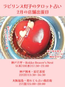 2/5(木)18(水)17:30~21:00 神戸六甲・Rokko Beaver’s Nestさん 2/22(日)13:30~16:30 神戸岡本・辰巳茶房さん 2/27(金)15:00~20:00 大阪福島・売れても占い商店街さん